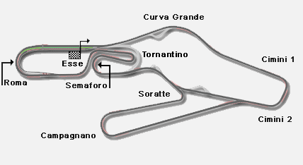 The Autodromo di Vallelunga. The circuit length (including the post-2004 extension) is 2.538 miles (4.085 km). Races are run clockwise.