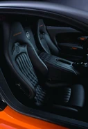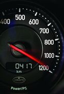 The Veyron is the quickest production car to reach 100 km/h (62 mph) with an estimated time of 2.5 seconds. It also reaches 200 and 300 km/h (124 and 186 mph) in 7.3 and 16.7 seconds respectively. This makes the Veyron the quickest-accelerating production car in history. It also consumes more fuel than any other production car, using 40.4 L/100 km (4.82 mpg) in city driving and 24.1 L/100 km (10 mpg) in combined cycle. At full-throttle, it uses more than 125 L/100 km (2.1 mpg)—at full throttle, the Veyron would empty its 100 L fuel tank in just 12.5 minutes. The car's everyday top speed is listed at 234 mph (377 km/h). When the car reaches 137 mph (220 km/h), hydraulics lower the car until it has a ground clearance of about 3 1/2 inches (8.9 cm). At the same time, the wing and spoiler deploy. This is the "handling" mode, in which the wing helps provide 770 pounds (3425 newtons) of downforce, holding the car to the road[1]. The driver must, using the key, toggle the lock to the left of his seat in order to use the maximum speed of 253.2 miles per hour (407.5 km/h). Theoretically it can go faster but it is electronically limited to 253.2 miles per hour (407.5 km/h) to prevent tire damage. The key functions only when the vehicle is at a stop when a checklist then establishes whether the car—and its driver—are ready to enable 'top speed' mode. If all systems are go, the rear spoiler retracts, the front air diffusers close and the ground clearance, normally 4.9 inches (12.4 cm), drops to 2.6 inches (6.6 cm).