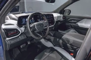 We were able to get a peek inside the loaded RST model and were impressed with what we saw. That truck featured a fixed glass roof, black-and-white two-tone leather upholstery with red piping, and about the same passenger space as a regular Silverado crew cab pickup truck. Rather than a console-mounted shifter, Chevrolet's designers have opted for a column mounted stalk, which creates space for a massive storage bin between the dashboard and middle armrest.