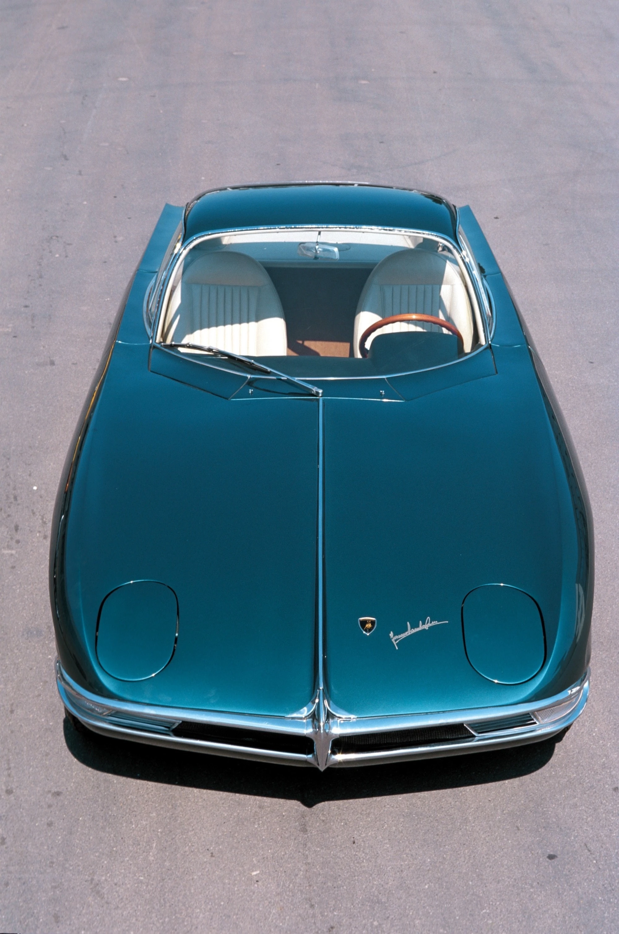The 350 GTV was never a complete, driveable car during its time as a Lamborghini prototype. During assembly, the workforce discovered that the body panels would not fit around the engine. Since he had no further plans for the 350 GTV beyond being a show car, Mr. Lamborghini had the engine bay ballasted with bricks and kept the bonnet shut throughout the Turin Auto Show. The incomplete show car also lacked brake calipers, foot pedals and windshield wipers.