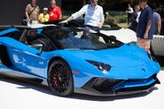 Lamborghini Aventador LP 750-4 SuperVeloce Roadster was unveiled at the 2015 Pebble Beach Concours d'Elegance. It features a compact two-piece carbon fiber hard top that can be stowed in the trunk like the previous roadster. Numerous weight-saving measures have lowered the Roadster’s weight to 1,575 kg (3,472 lb), a figure that makes it 50 kg (110 lb) lighter than the regular. In the US it is expected to be priced from US$530,075 excluding tax. Deliveries began in the first quarter of 2016.