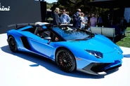 - The Lamborghini Aventador SuperVeloce LP 750-4 Roadster was unveiled at the 2015 Pebble Beach Concours d'Elegance. It features a compact two-piece carbon fiber hardtop that can be stored in the trunk like the standard roadster. Numerous weight-saving measures have led the Roadster's weight to 1,575 kg (3,472 lb), a figure that makes it 50 kg (110 lb) lighter than the standard roadster. Deliveries began in the first quarter of 2016 and production was limited to 500 units.