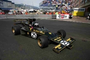 Chapman responded by upgrading the 76 to 'B' specification, with enlarged sidepods and better cooling. The revised car first appeared at the German Grand Prix, Peterson qualifying eighth and finishing fourth, just ahead of Ickx in the 72.[4] Peterson then drove the 72 in the Austrian and Italian Grands Prix (winning the latter), leaving Ickx to drive the 76 in these races: the Belgian could only qualify 22nd in Austria and retired after a collision with Patrick Depailler's Tyrrell,[5][6] while in Italy he qualified 16th before retiring with a broken throttle linkage.[7]