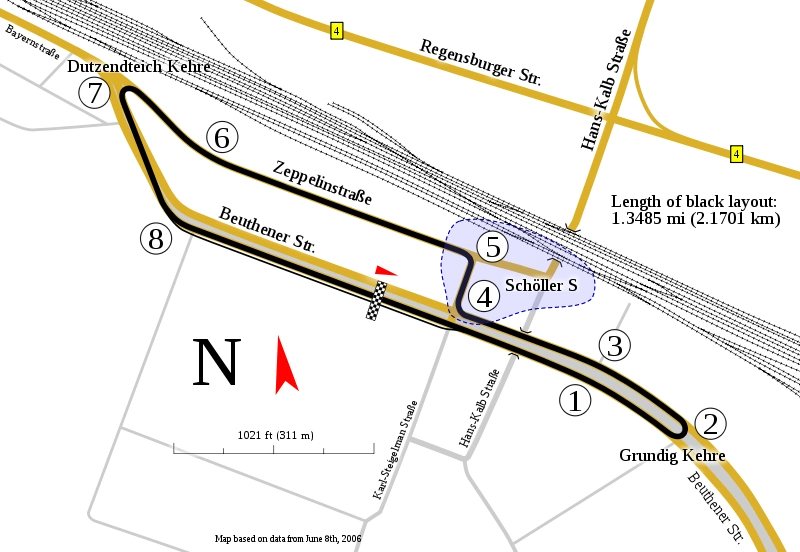 Since May 18, 1947, the motor sports events in the remaining 360 meters (or simply Zeppelinhaupttribüne Steintribüne) are performed in the streets of public transit. Different configurations were used in the early years, including 8 different layouts.The main event of this circuit is the stage of DTM.