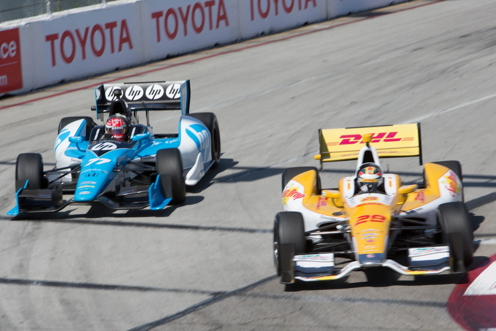 Hunter-Reay (right) competing with Simon Pagenaud at the 2012 Toyota Grand Prix of Long Beach on the Streets of Long Beach.