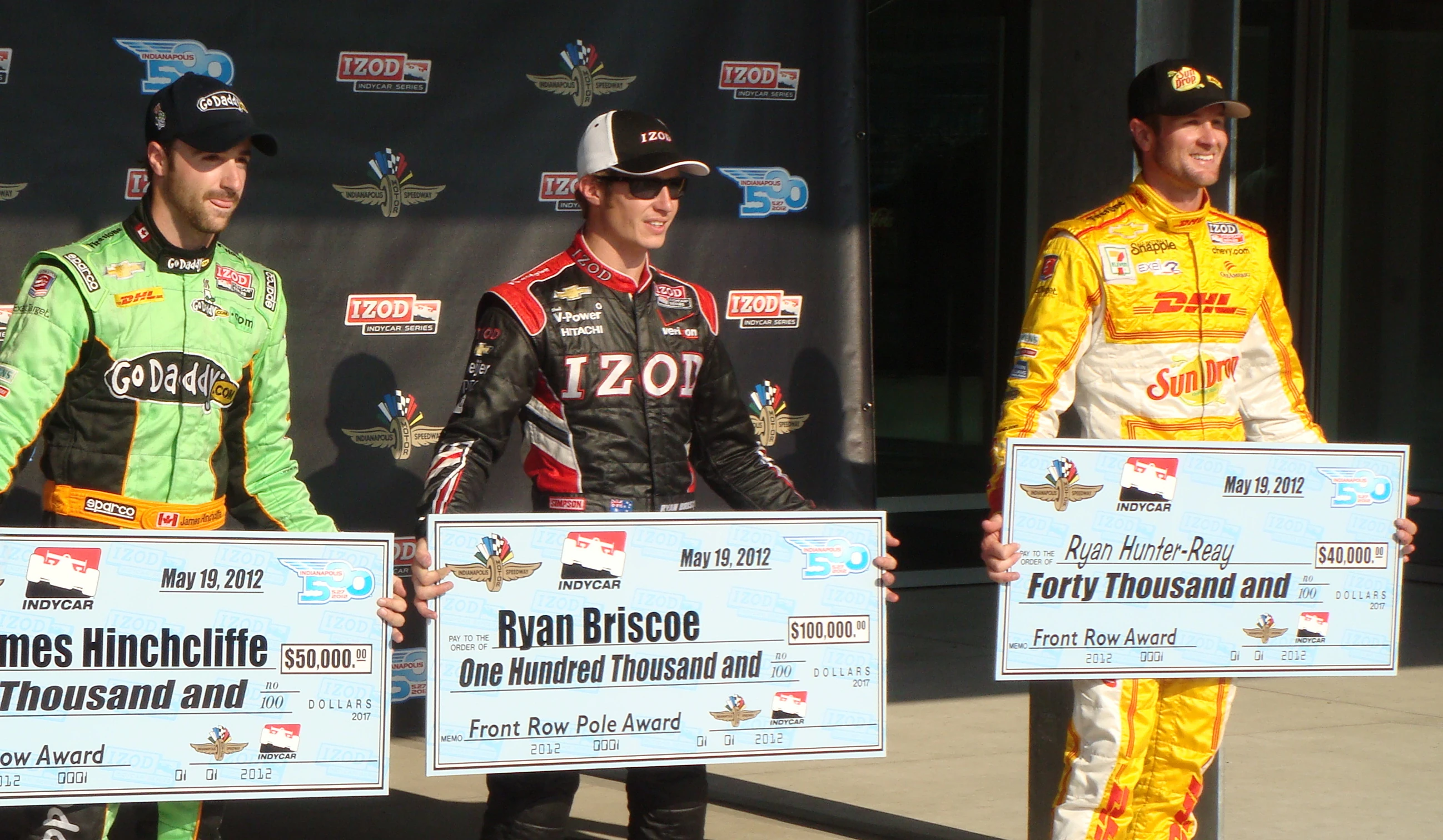 Hunter-Reay (right) posing with teammate James Hinchcliffe and Ryan Briscoe following Pole Day qualifying for the 2012 Indianapolis 500.