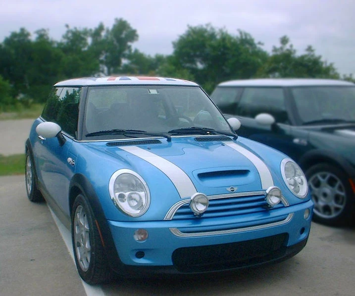 A 2004 MINI Cooper S, with intercooled 1.6 l centrifugal belt-driven supercharger. Note the hood scoop which supplies cool air to the intercooler.